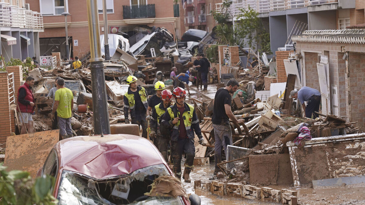 Firefighters walk as people try to clear up the damage after floods in Massanassa, just outside of Valencia, Spain. Picture: AP Photo/Alberto Saiz