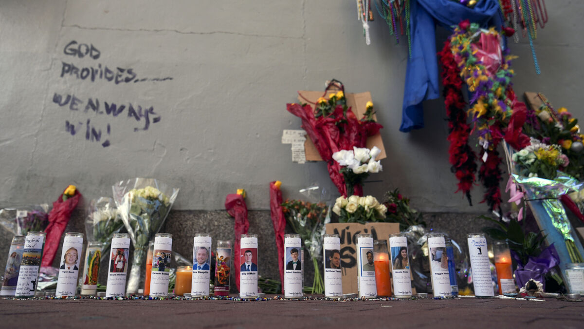 A makeshift memorial has been set up on Bourbon Street, with crosses and photos of the victims surrounded by candles, flowers and teddy bears.