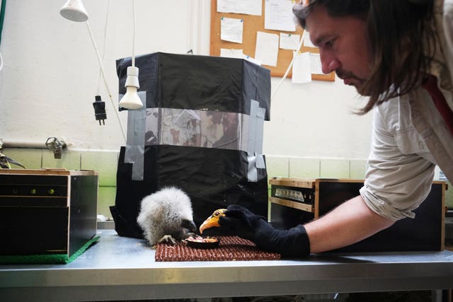 The first-born is being kept in a box and fed using a puppet designed to mimic a parent bird, while another is expected to hatch in the next few days.