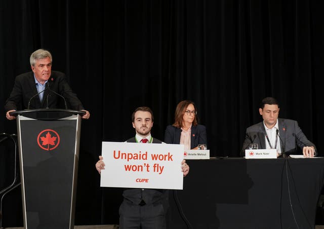 Some flight attendants at the airline’s news conference on Thursday held up signs that read “Unpaid work won’t fly” and “Poverty wages = UnCanadian”.