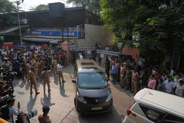 Bollywood actors in their vehicles leave cremation center after paying their tributes to Bollywood actor Dharmendra (Rafiq Maqbool/AP)