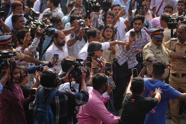 Bollywood actor Shabana Azmi, center, arrives at a cremation center to pay homage to Bollywood actor Dharmendra (Rafiq Maqbool/AP)