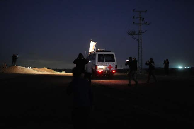 A Red Cross convoy carrying the remains of a person believed to be Dror Or makes its way towards the border crossing with Israel on Tuesday Picture: Abdel Kareem Hana/AP