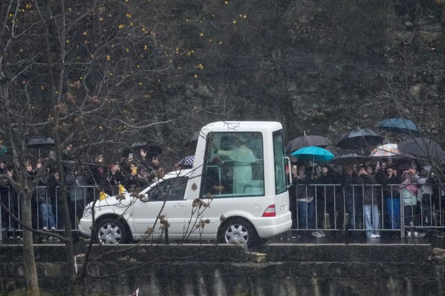 Bells rang as Leo’s covered vehicle snaked its way through the rain to the monastery where he prayed quietly in the darkened tomb and offered a lamp as a gift of light for the community.