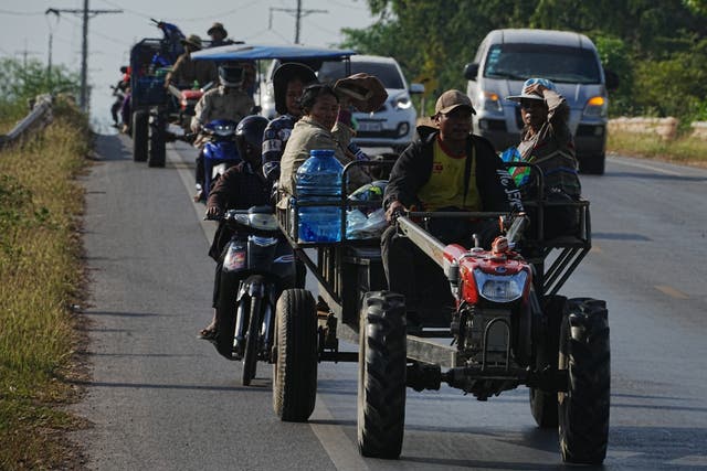 An evacuation shelter at a university in Thailand’s north-eastern city of Surin hosted more than 3,600 people who were relocated from the danger zones. They sat or lay on thin mats and several set up small tents. At lunchtime, some lined up to receive cooked rice, while others were served ready-to-eat meals. An army band played for their entertainment.