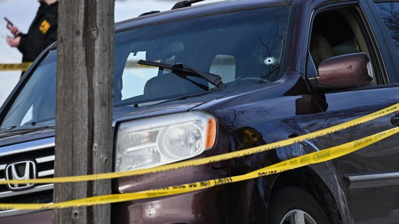 A bullet hole is seen in the windscreen of a crashed car as law enforcement officers work at the scene of the shooting. Picture: Tom Baker/AP Photo