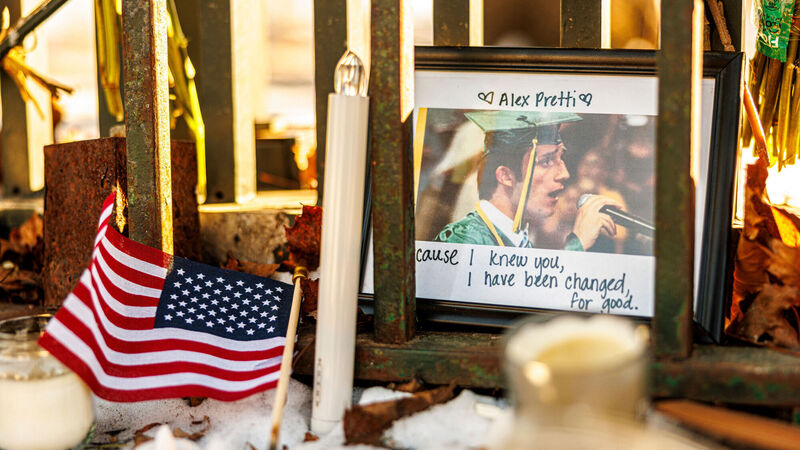 A framed photograph of Alex Pretti sits at a memorial outside the Minneapolis VA hospital. Picture: Kerem Yücel/Minnesota Public Radio/AP