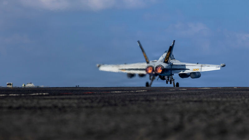 EA-18G Growler launching from the flight deck of the Nimitz-class aircraft carrier USS Abraham Lincoln in the Indian Ocean. Picture: U.S. Navy via AP