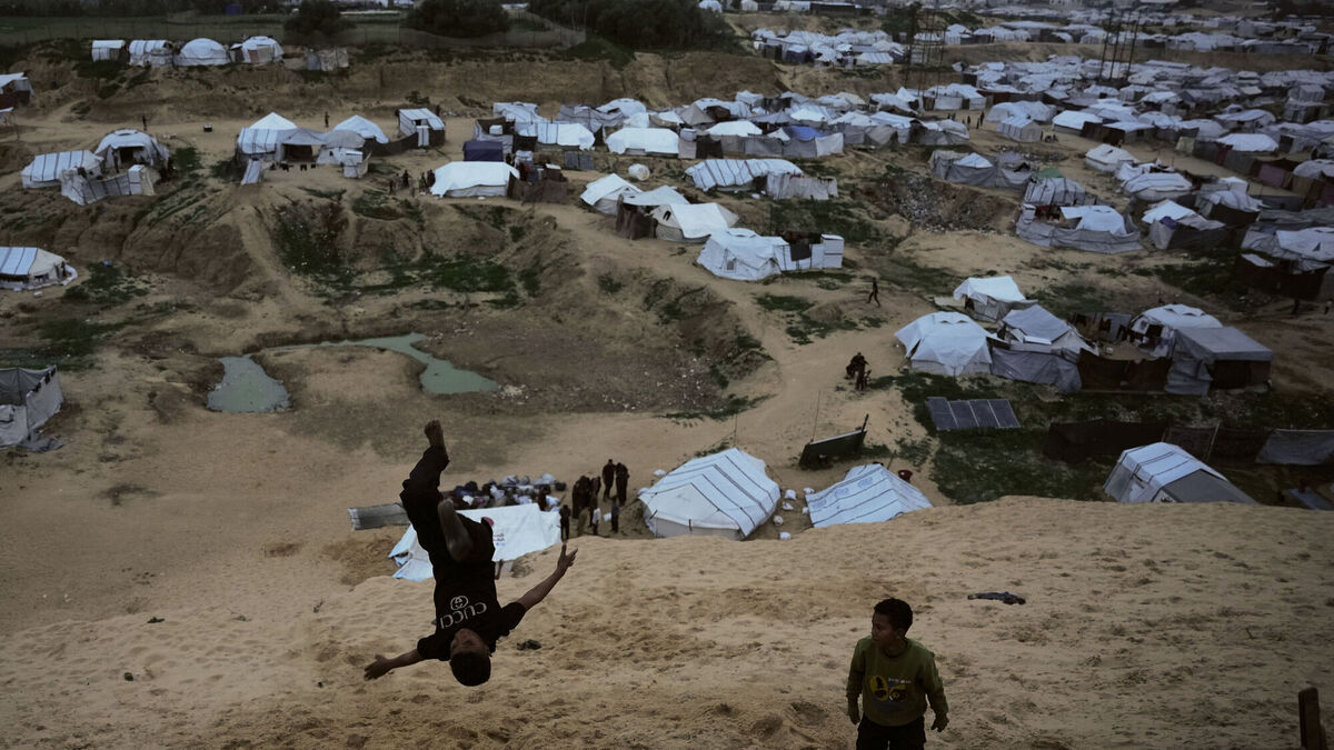 Children practice parkour on a sand dune near tents housing displaced Palestinians in Deir al-Balah, central Gaza Strip, Sunday, Feb. 1, 2026. Pictire: AP Photo/Abdel Kareem Hana