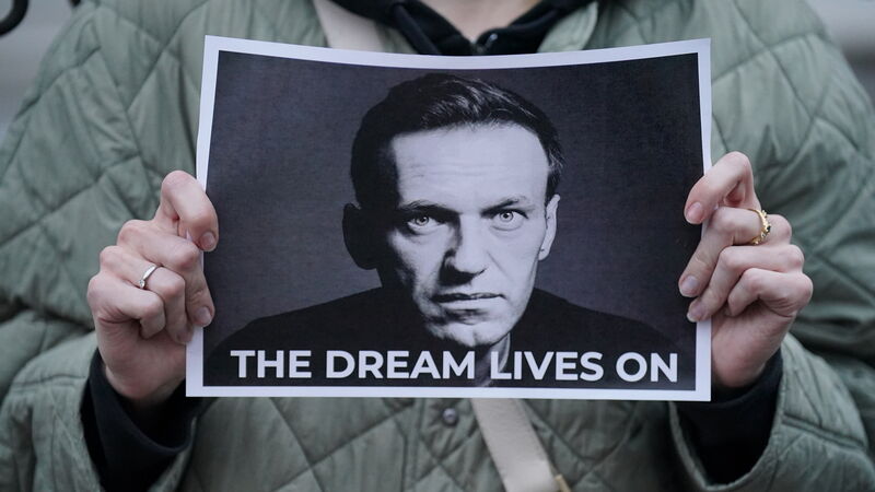 A protester holding a picture of Alexei Navalny at a protest opposite the Russian Embassy in London in 2024. Picture: Jonathan Brady/PA