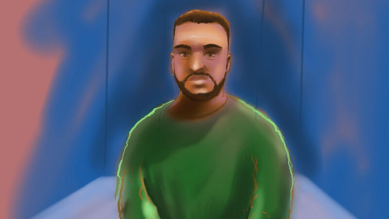 A court sketch depicts accused Bondi shooter Naveed Akram appearing via video link from Goulburn Supermax prison, at Downing Centre Local Court in Sydney, Monday, Feb. 16, 2026. Picture: Rocco Fazzari/AAP Image via AP