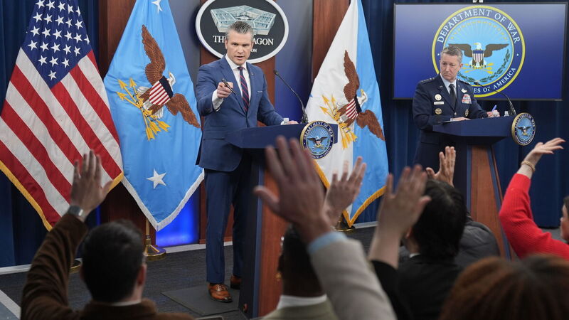 Defense Secretary Pete Hegseth and Chairman of the Joint Chiefs of Staff Gen. Dan Caine take questions during a press briefing at the Pentagon, Monday, March 2, 2026, in Washington. (AP Photo/Mark Schiefelbein)