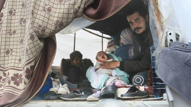 A displaced family sits in the back of a pickup truck, their current home, covered in plastic sheeting for protection from stormy weather along the seafront corniche, in the southern city of Sidon. Picture: Mahmoud ZAYYAT / AFP via Getty Images.