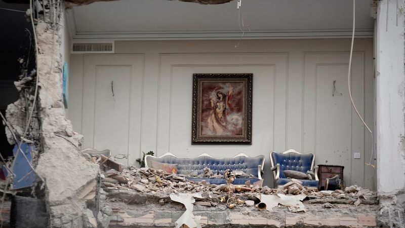 Rubble covers the furniture of a destroyed living room in a residential building in Tehran (Vahid Salemi/AP)