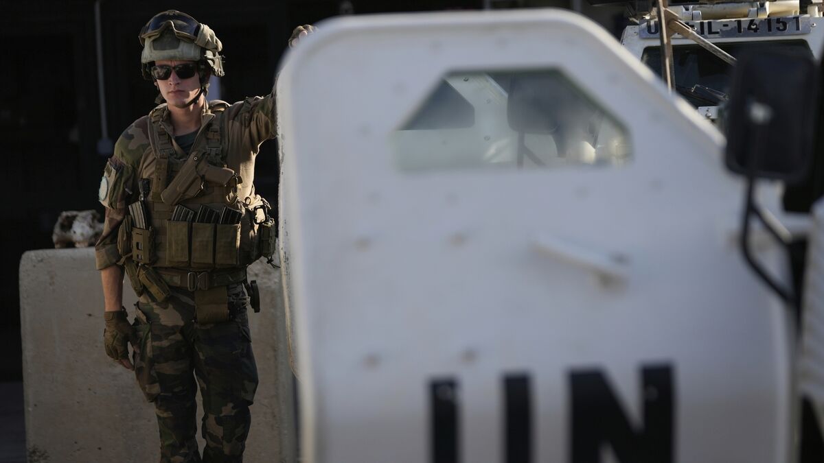 A French UN peacekeeper stands beside an armored vehicle at his base, waiting to move with his unit for a patrol along the Lebanese-Israeli border in Deir Kifa, southern Lebanon. (AP Photo/Hussein Malla)