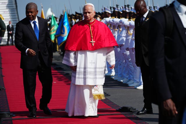 Pope Leo XIV is welcomed by Angola’s president, Joao Lourenco, left, as he arrives in Luanda (Andrew Medichini/AP)